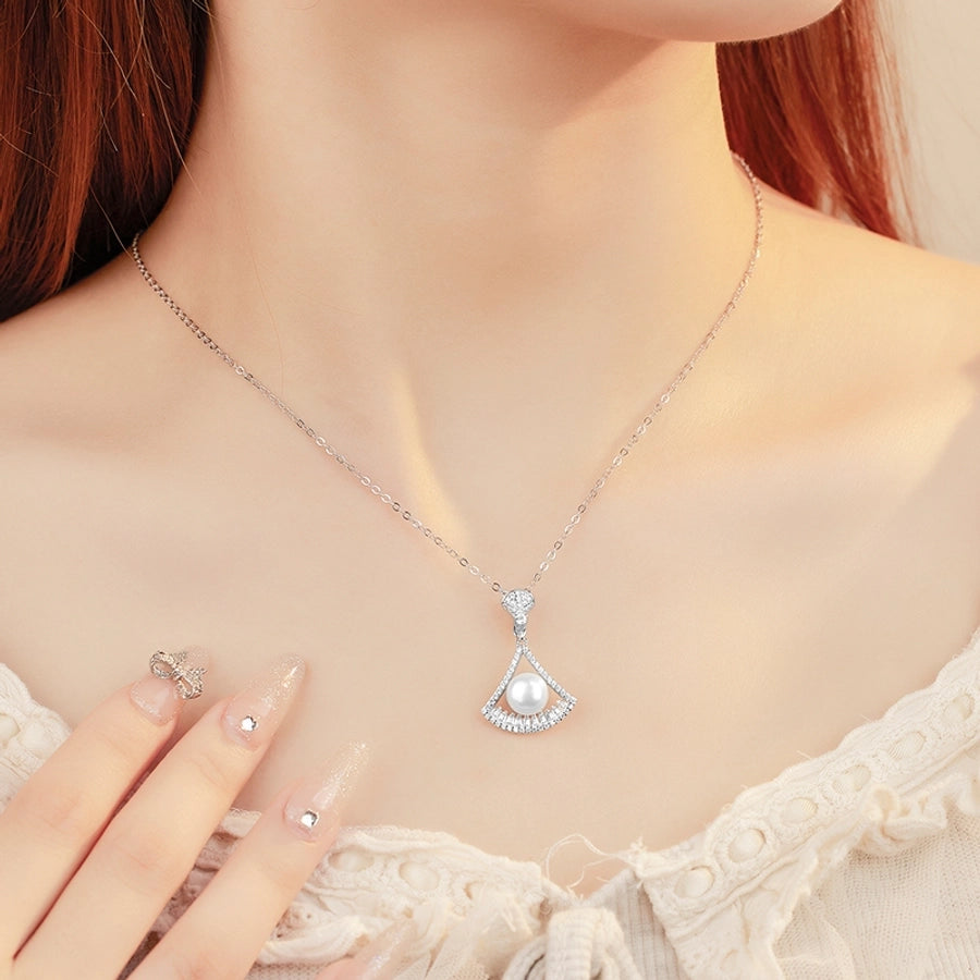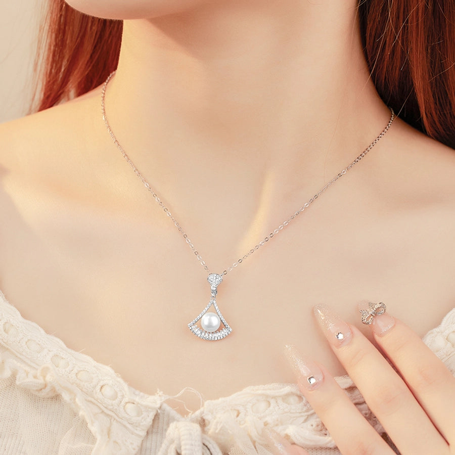 925 Sterling Silver Long-Lasting Plated Pearl Zircon cable chain Polishing Plating Inlay Geometric Sector Pendant Necklace