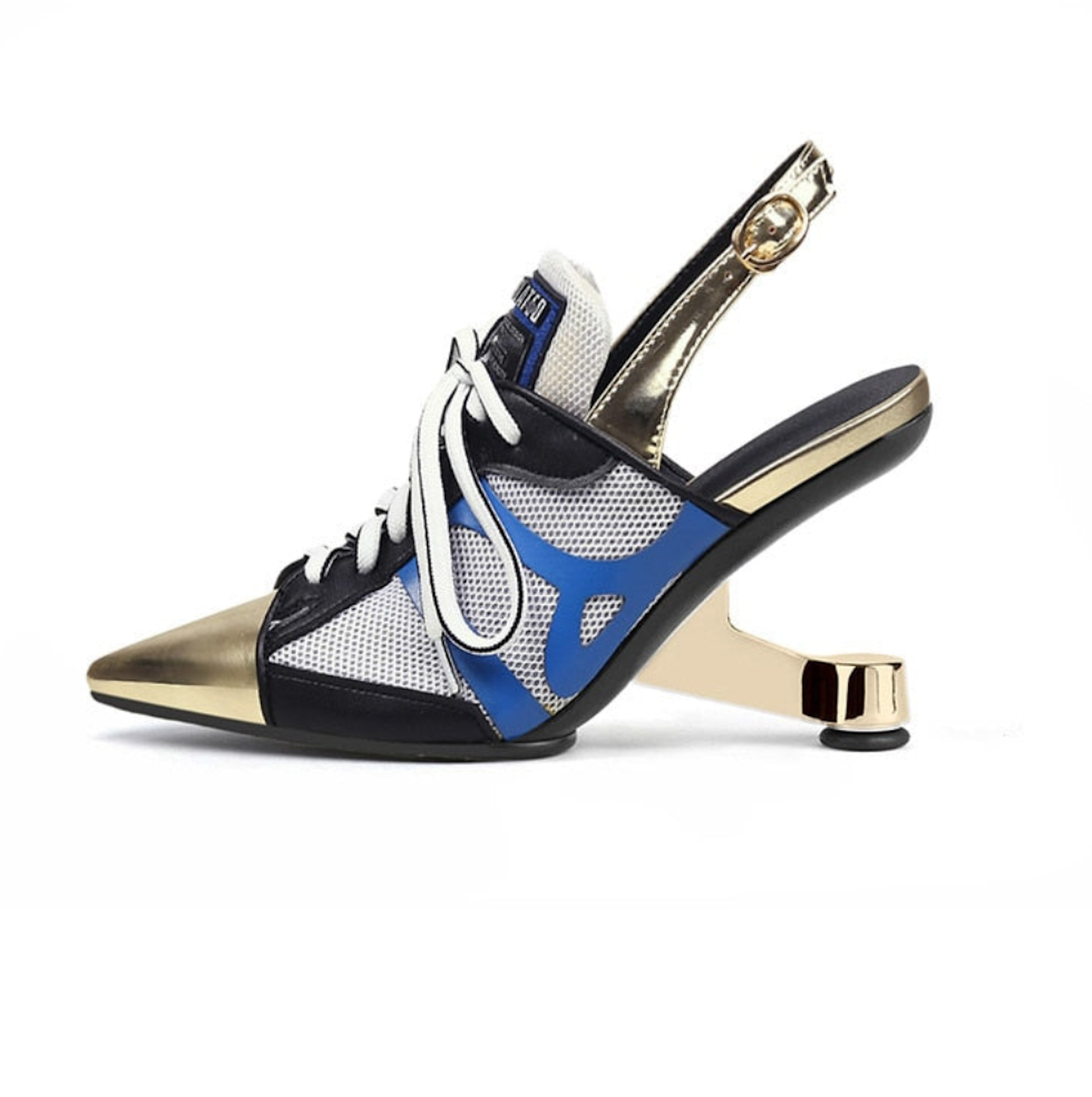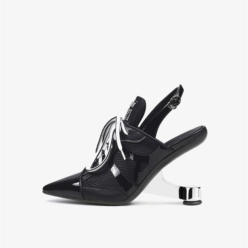 Introducing the Fusion Street Stilettos, a unique footwear innovation that combines the comfort of a sneaker, the breeziness of a sandal, and the elegance of a pump. These high heels stand out with their striking metal design and pointed toe, adding a contemporary edge to any outfit.