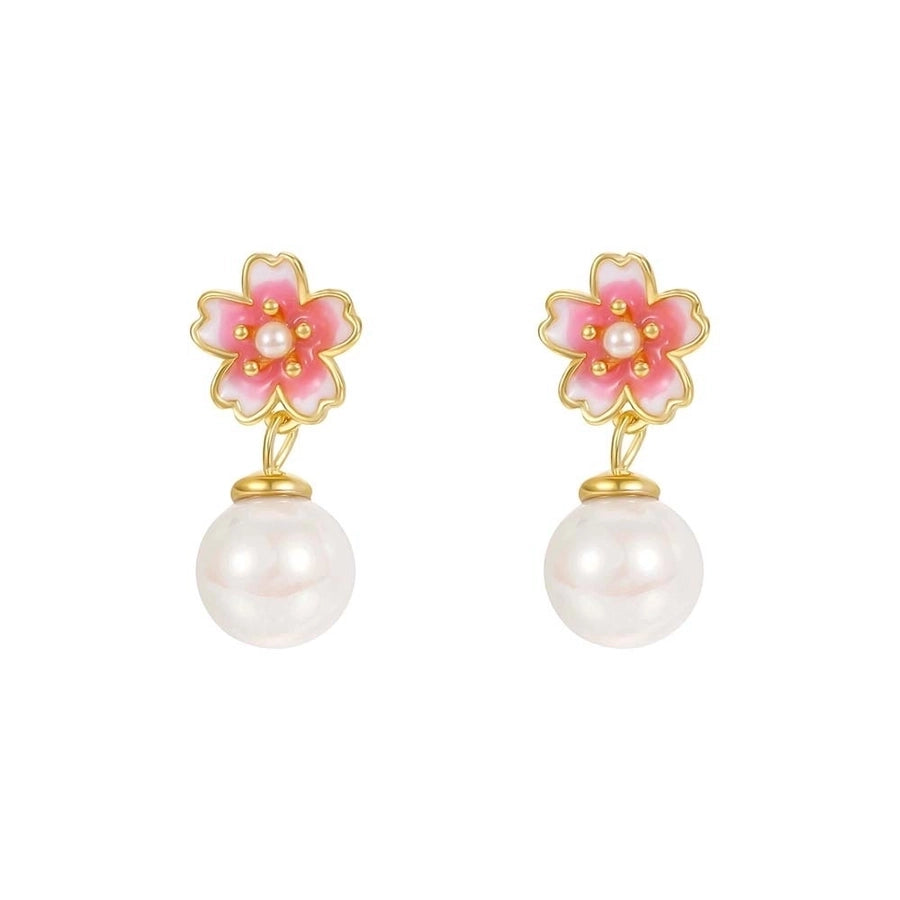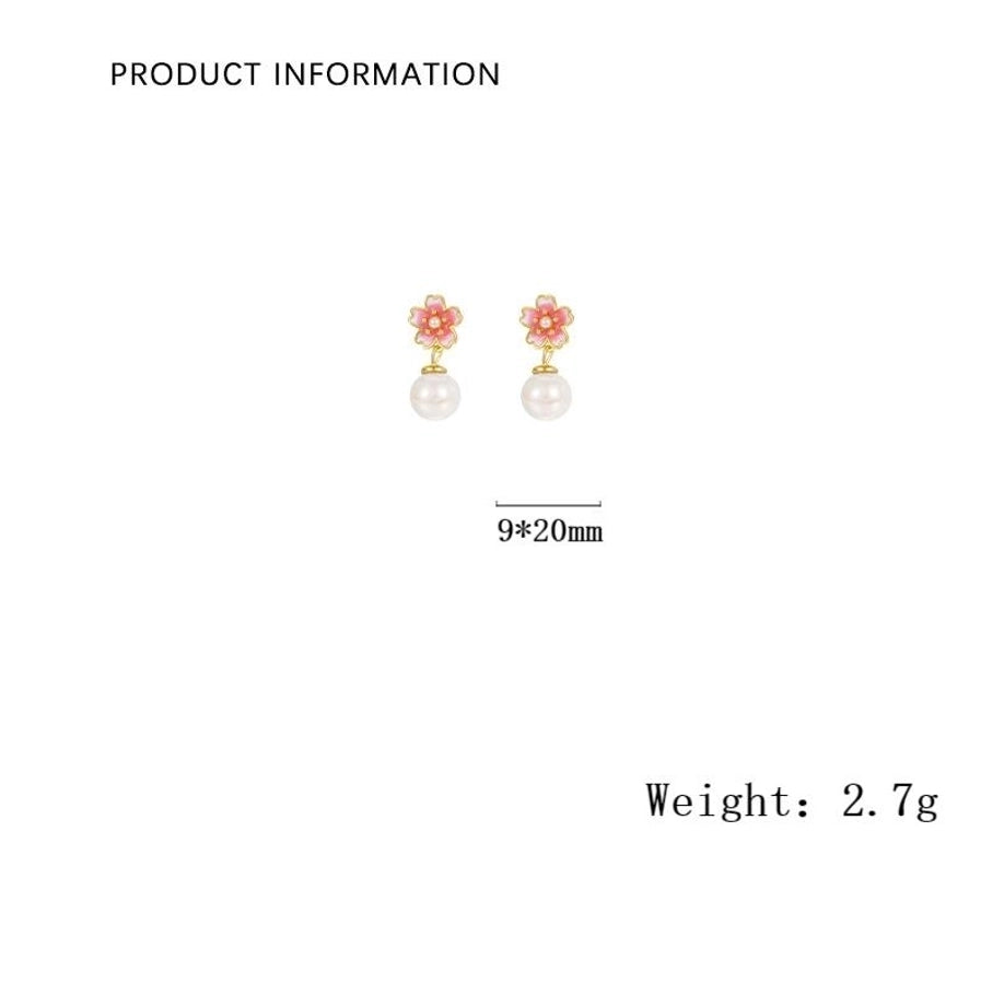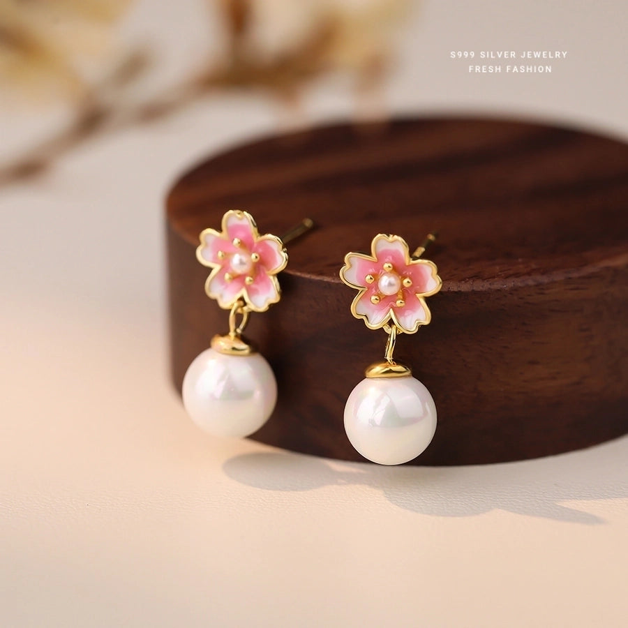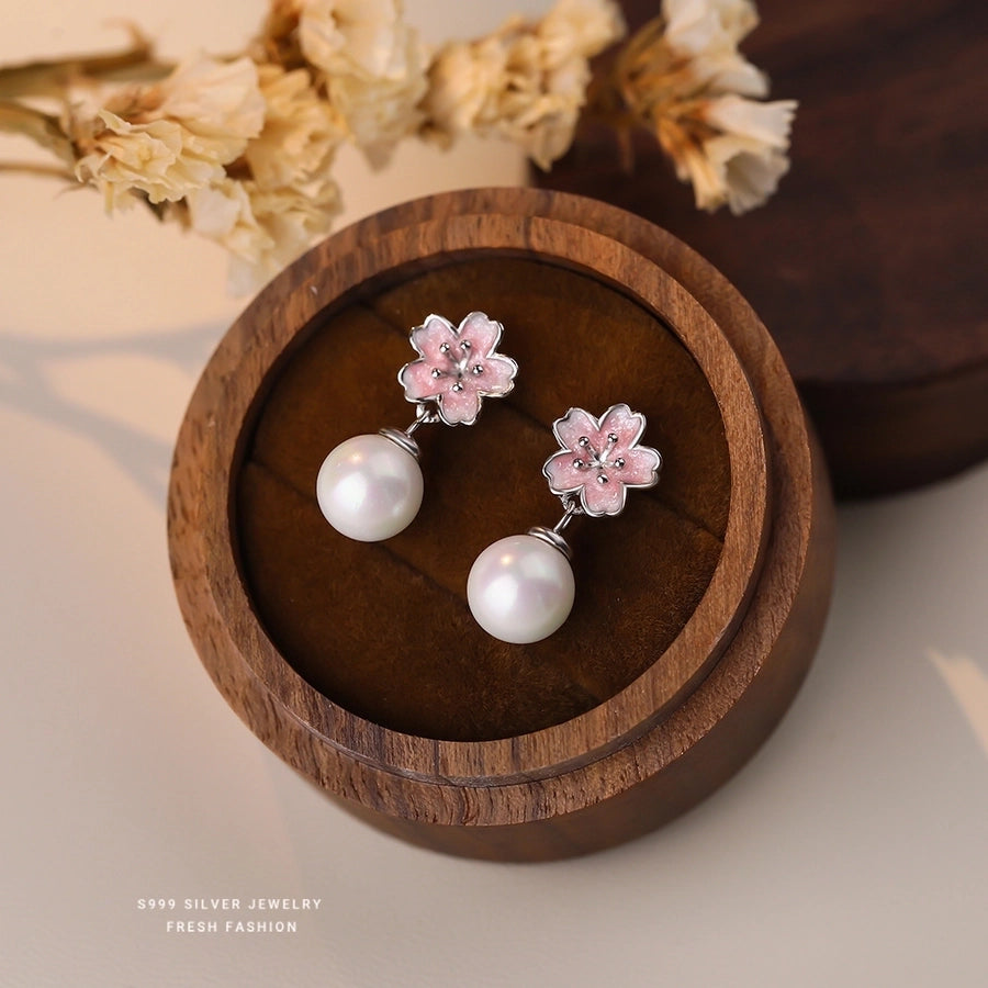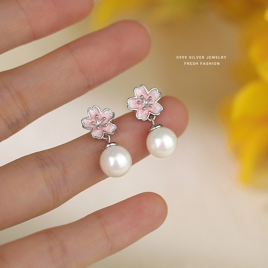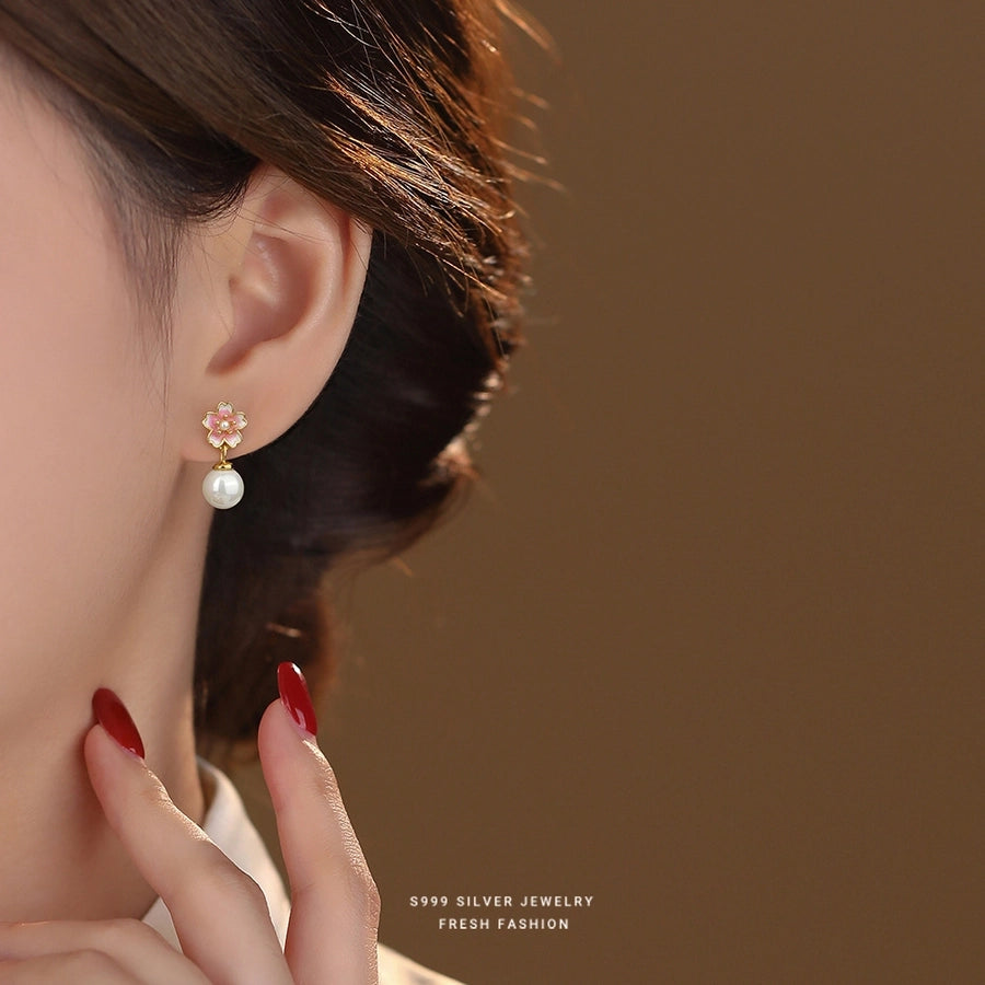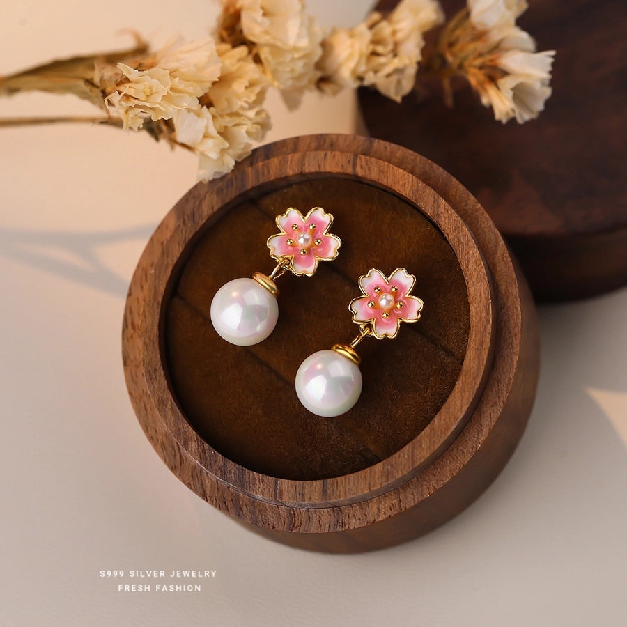 1 Pair S999 Silver Artificial Pearls Glass Bead 925 Sterling Silver Earrings Cherry Blossom Flower Drop Earrings