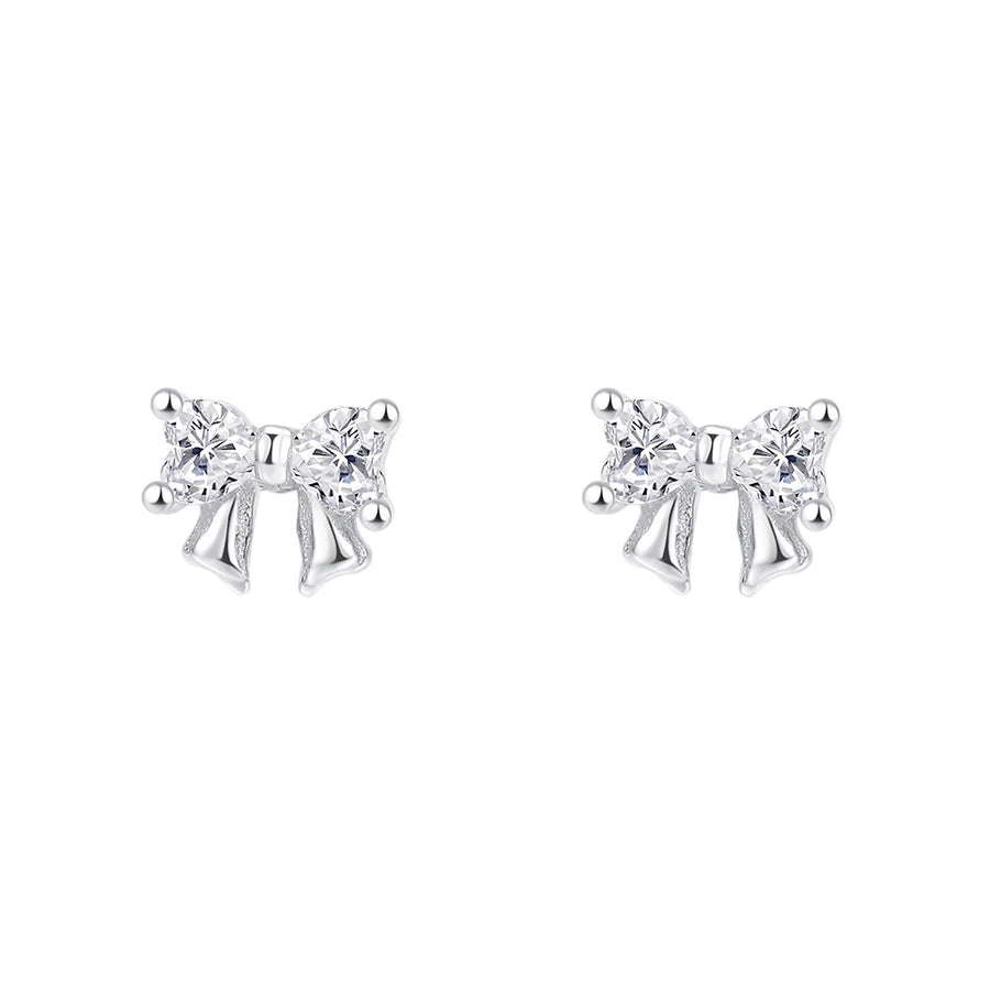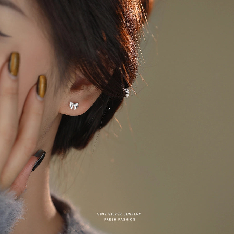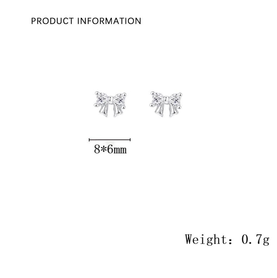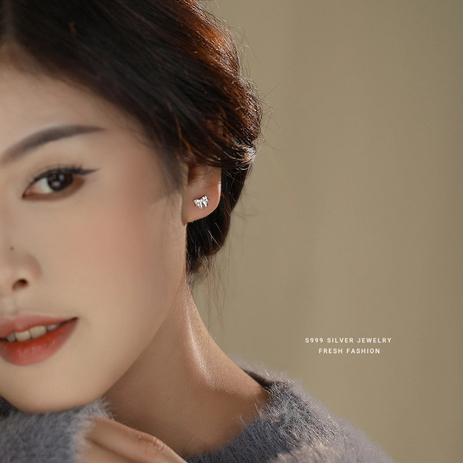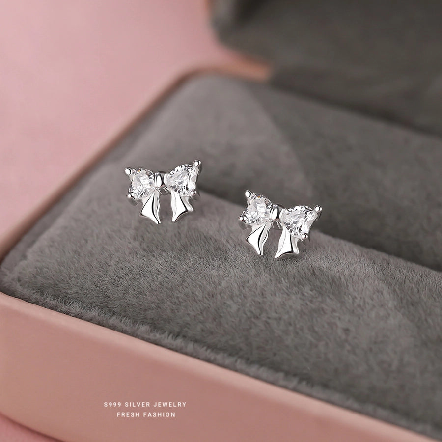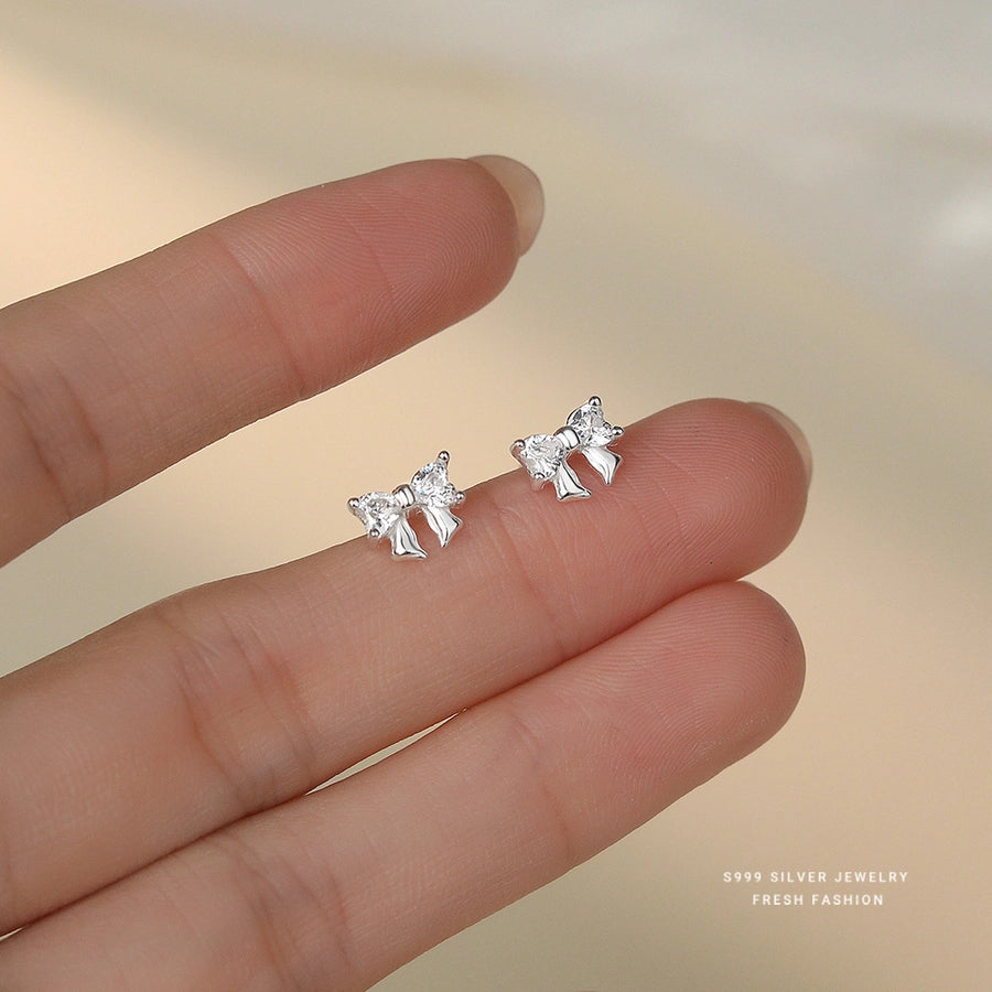 1 Pair S999 Silver Zircon 925 Sterling Silver Earrings Bow Knot Ear Studs