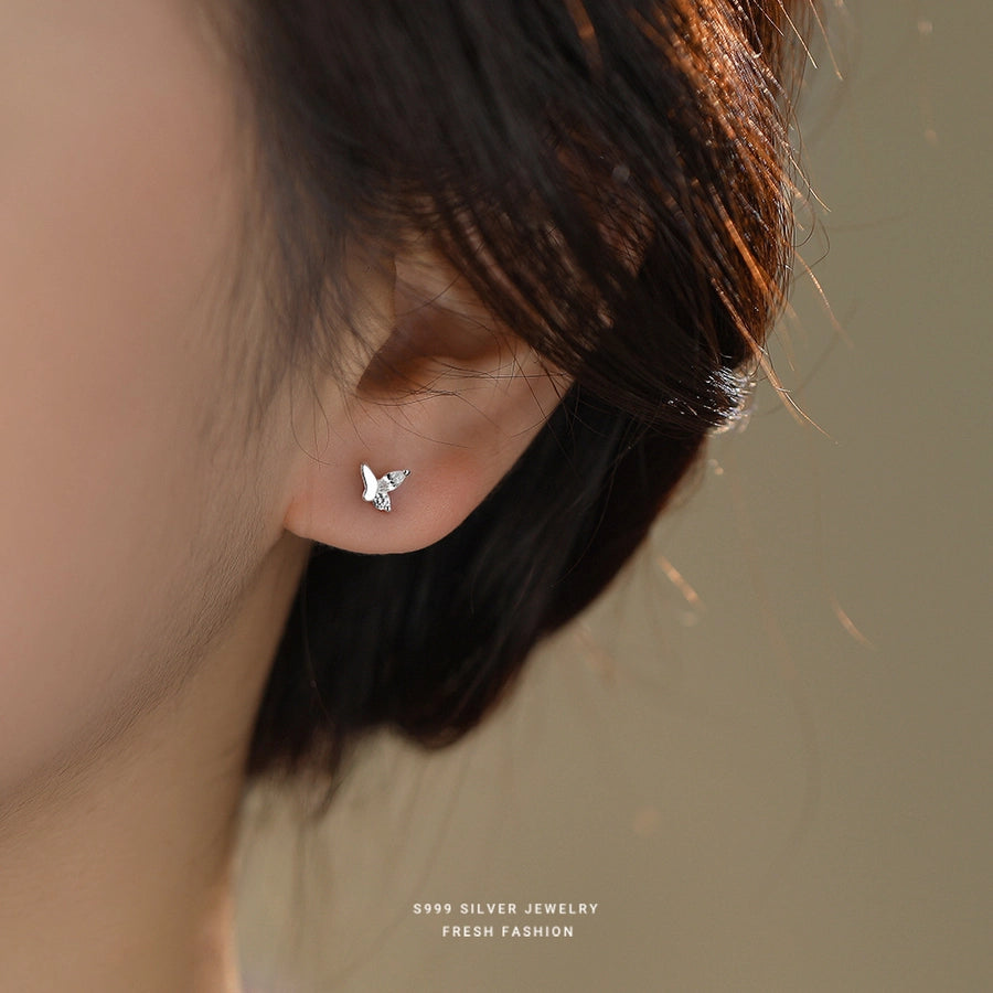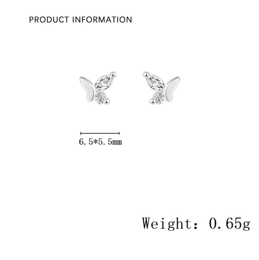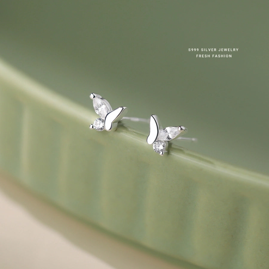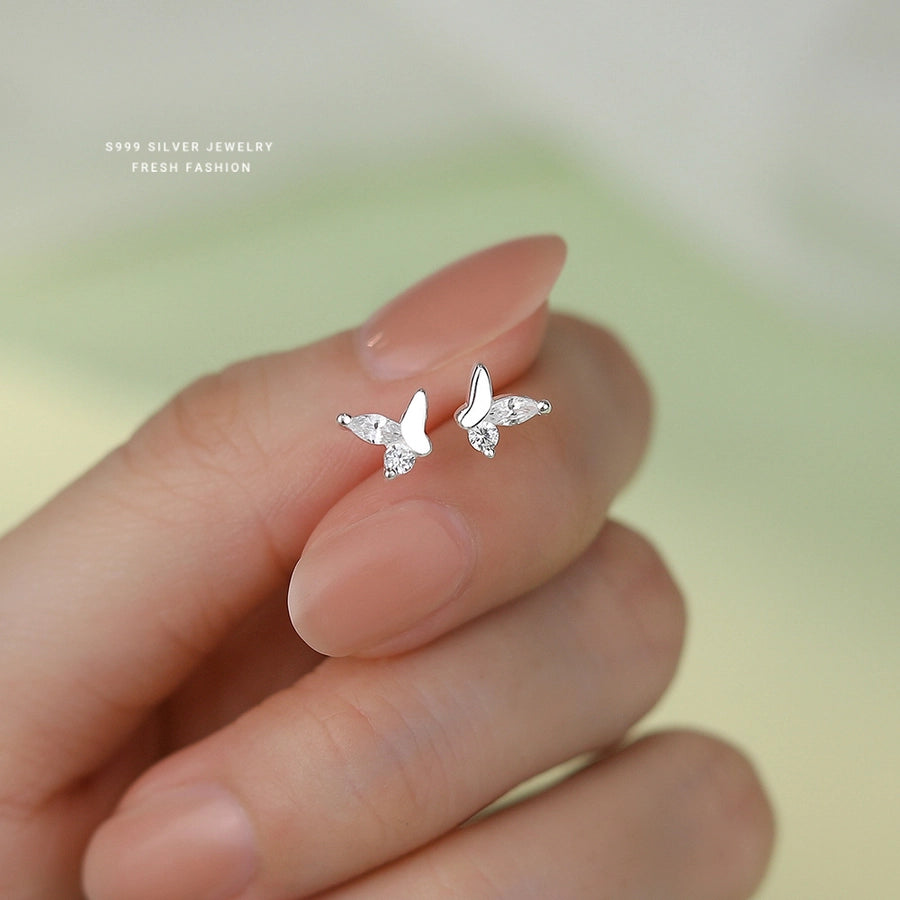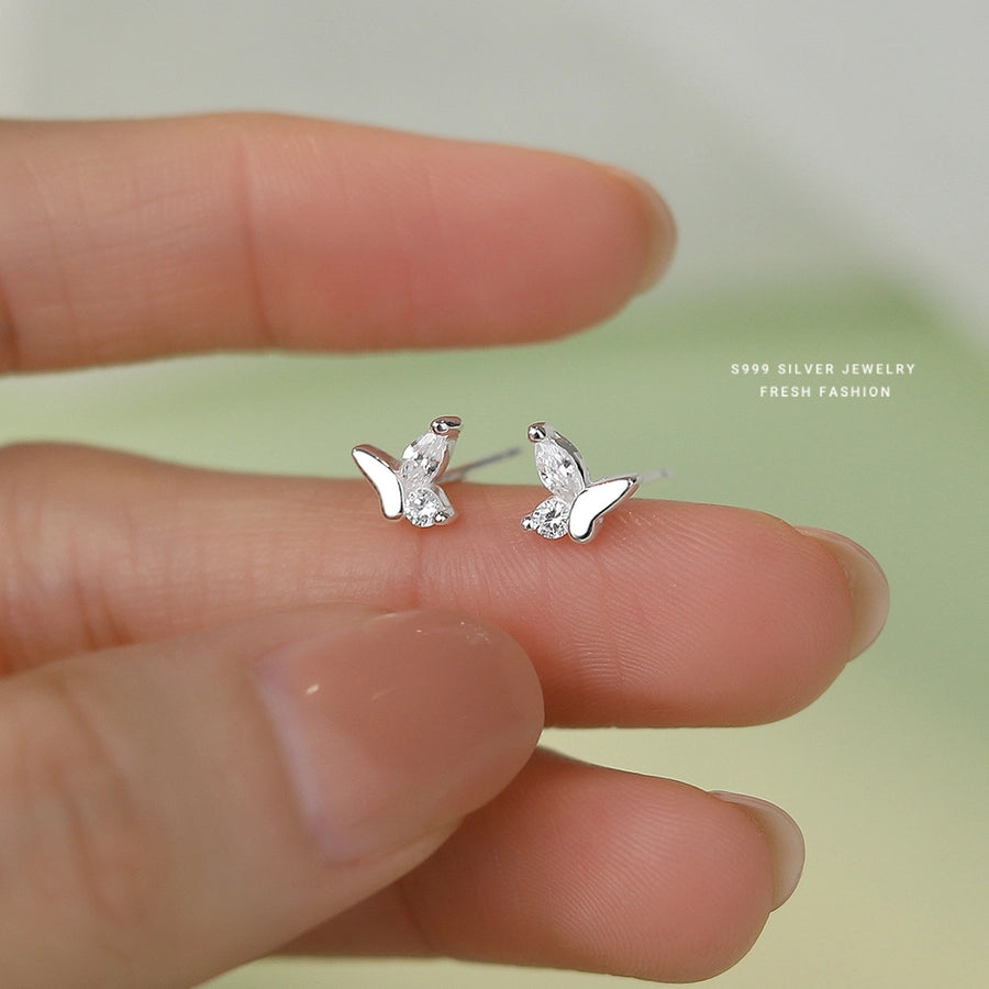 1 Pair S999 Silver Zircon 925 Sterling Silver Earrings Butterfly Ear Studs