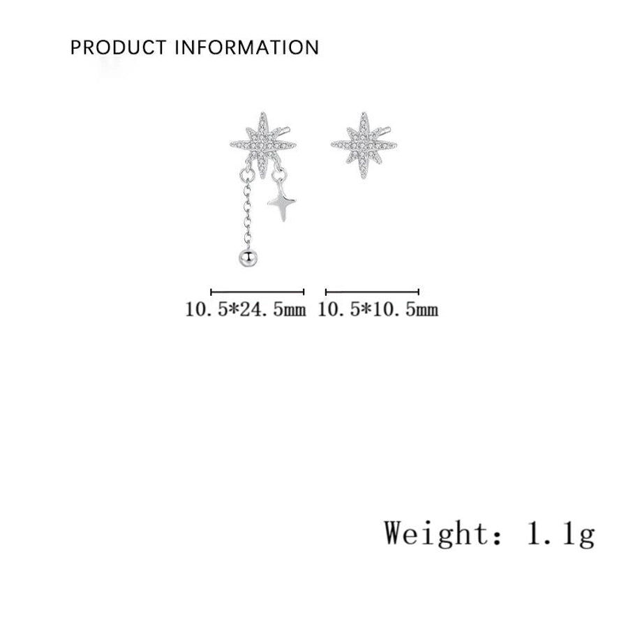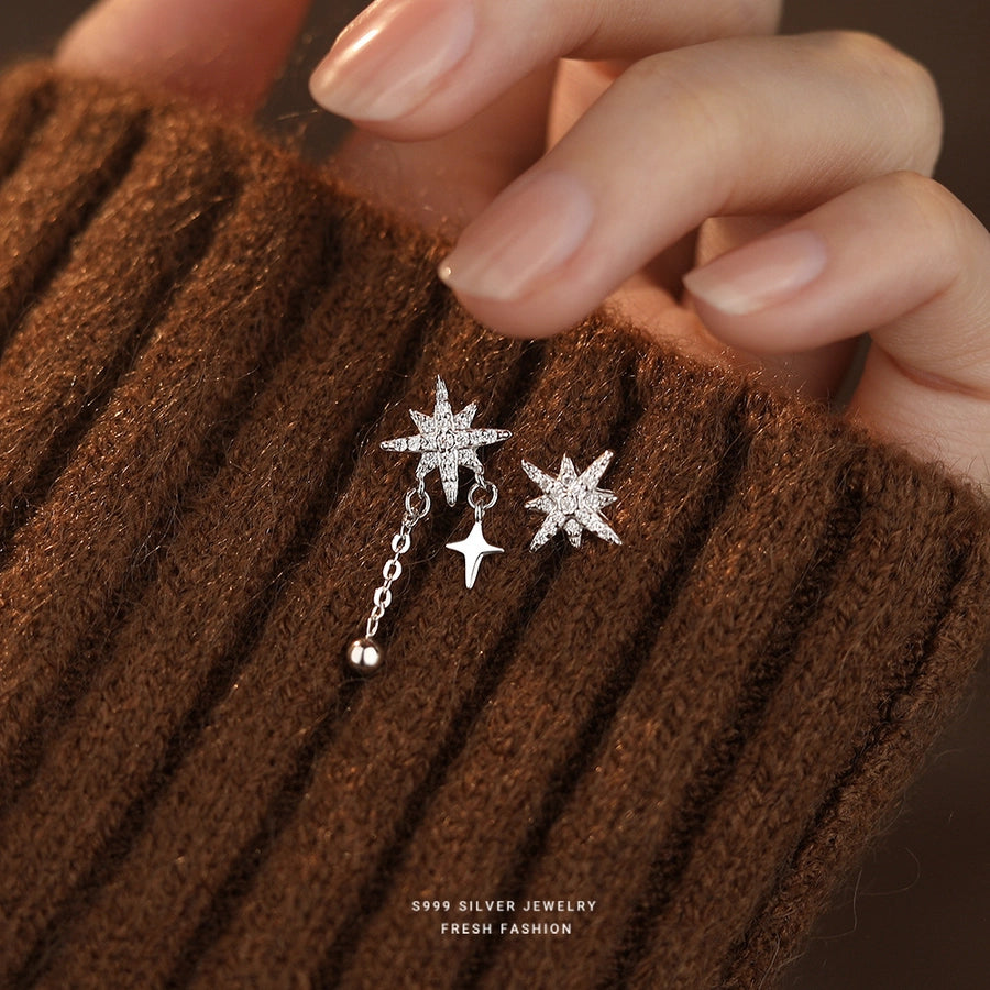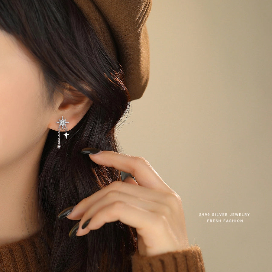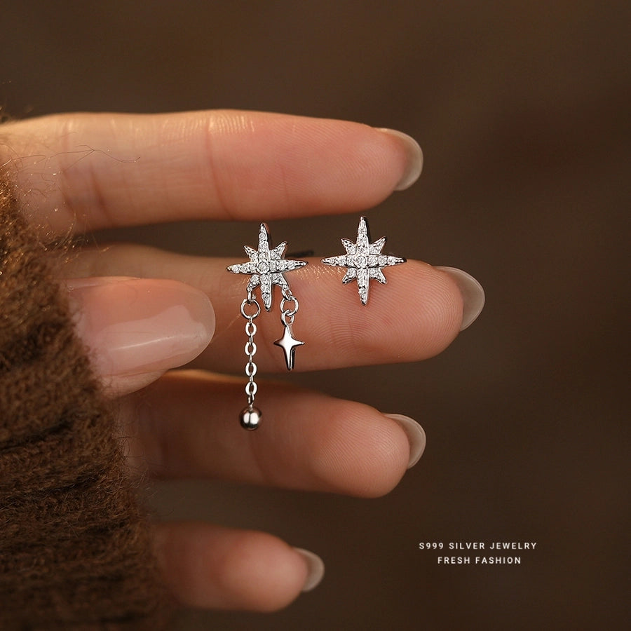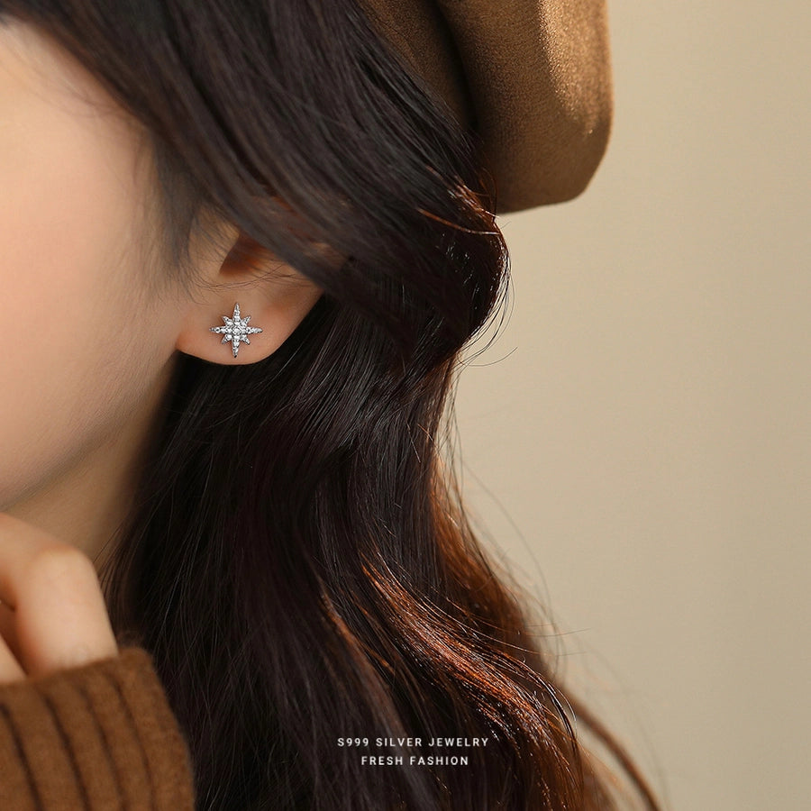 1 Pair S999 Silver Zircon 925 Sterling Silver Earrings Eight awn star Star Ear Studs