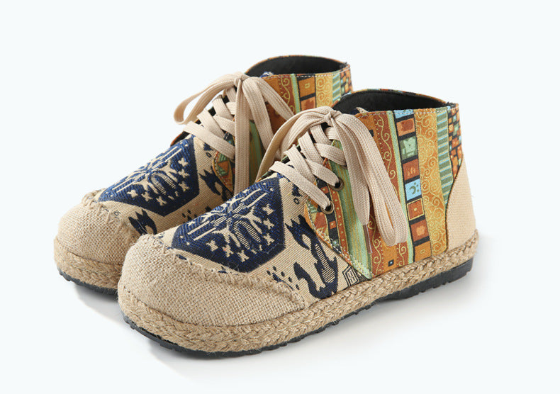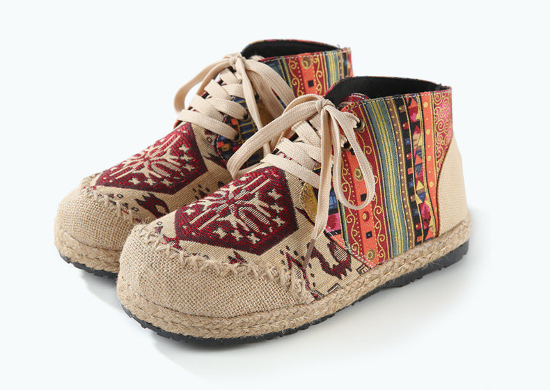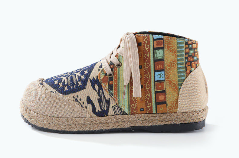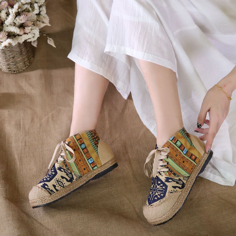 The durable canvas construction promises a breathable experience, allowing your feet to feel as free as your spirit. The earthy, espadrille-inspired base, wrapped in woven jute, roots the design in tradition, yet speaks to the contemporary soul. Our rubber soles lay the foundation for your adventures, ensuring you have the grip to explore every nook of the craft market or dance through every music festival.