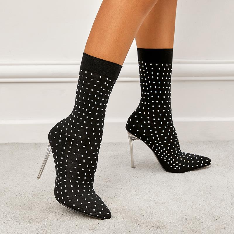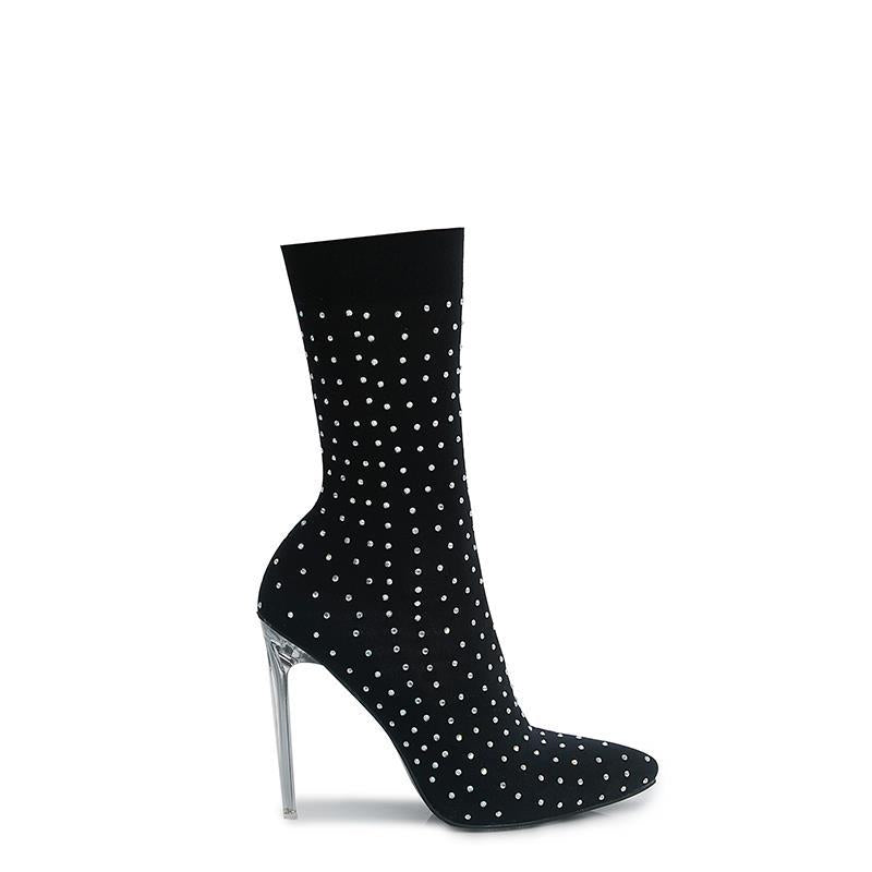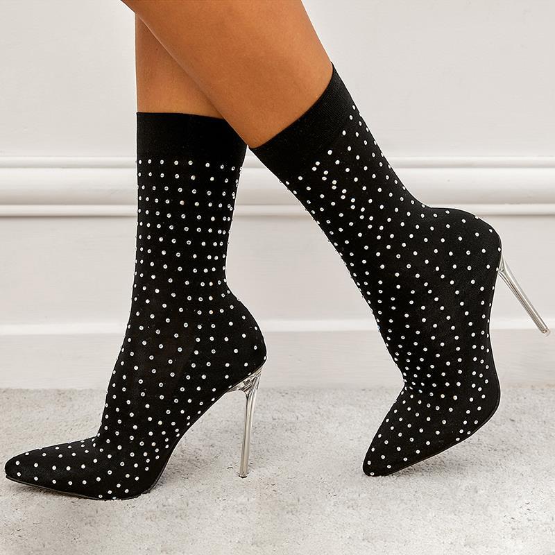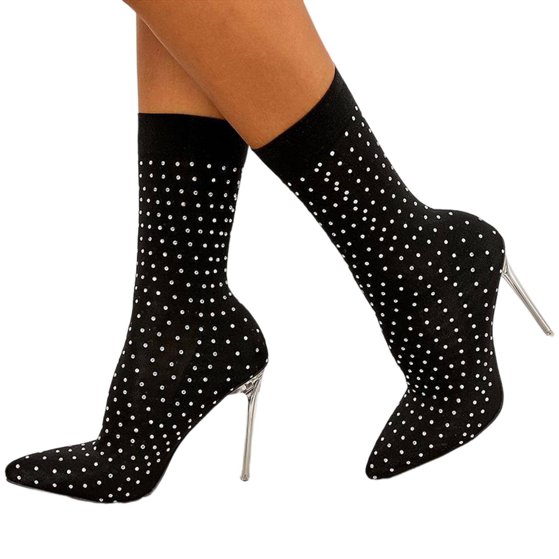 These rhinestone studded stocking high heels are the perfect accessory for your holiday party or night on the town! The rhinestones give this pair dazzling effect, while the traditional black color makes them easy to pair with any outfit or ensemble. These are a perfect dress up accessory for the modern girl on the go! These stocking heels would make a perfect gift, or compliment any shoe collection!