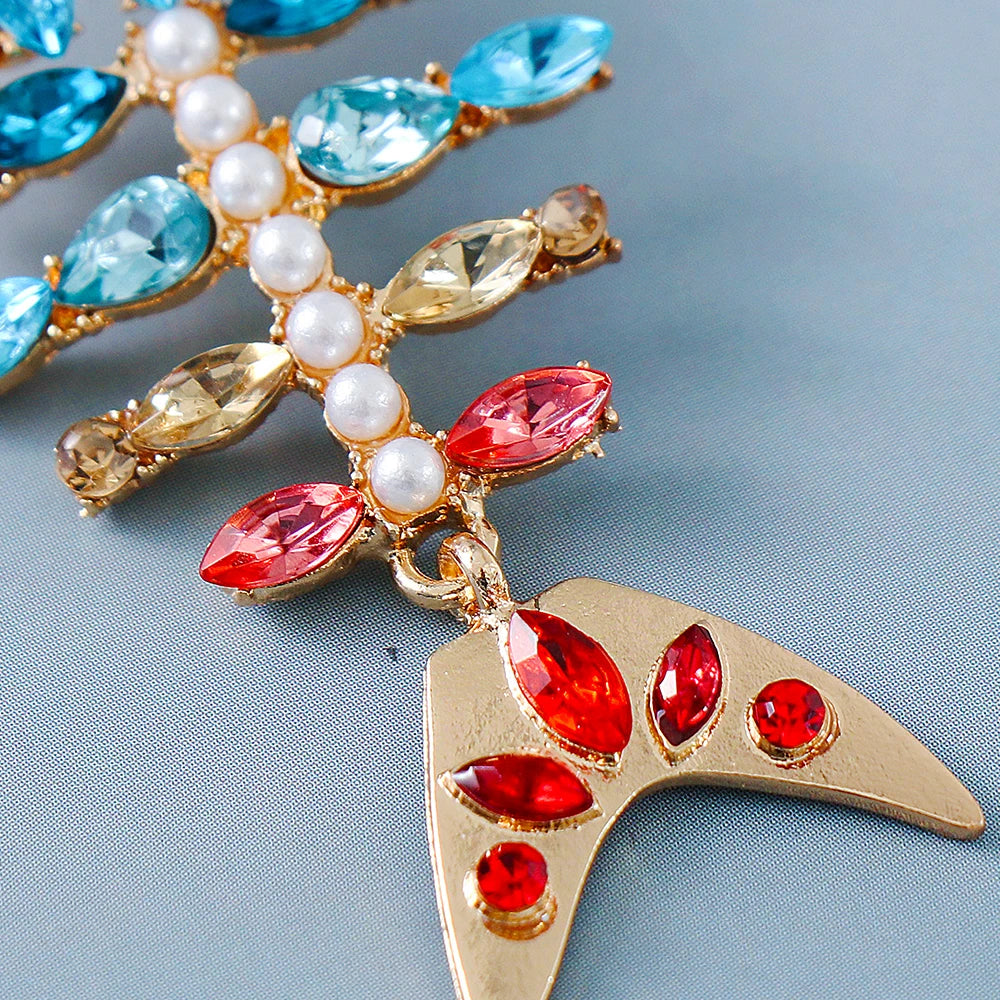 With an iridescent shimmer, these earrings cascade into an articulated fishbone design, each 'bone' encrusted with scintillating azure rhinestones that dance with light like waves under the summer sun.